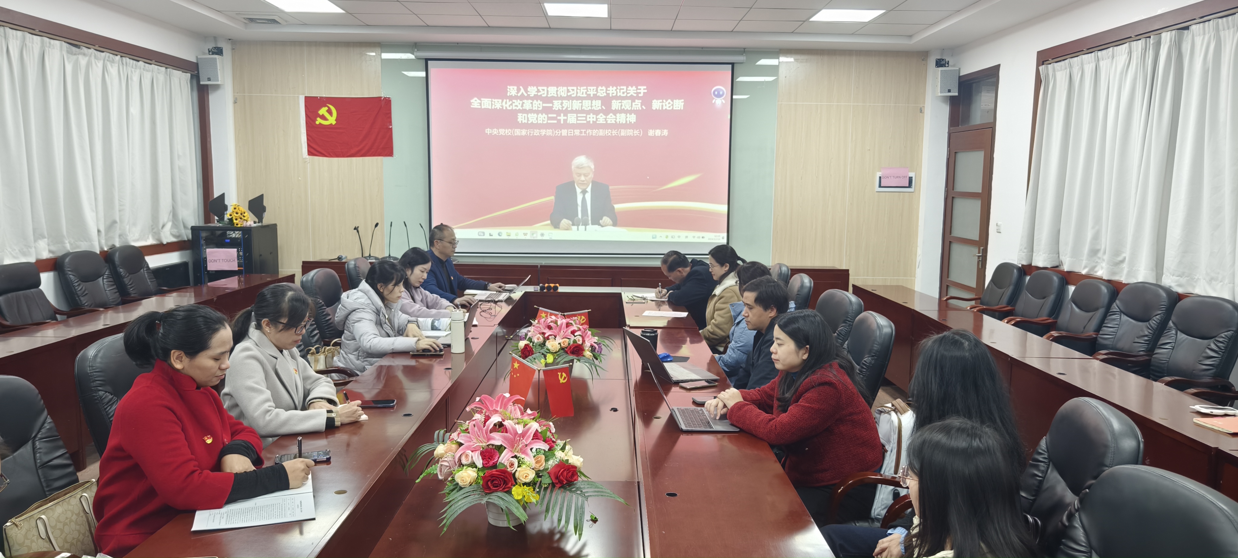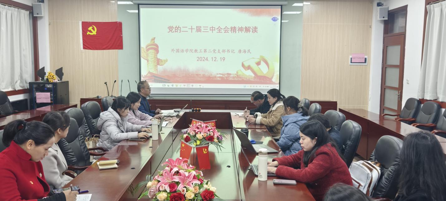12月19日中午第二行政楼308室,外国语学院教工第二党支部书记唐海民以“学习党的二十届三中全会精神 进一步全面深化改革、推进中国式现代化”为主题,为支部全体党员讲授学习贯彻党的二十届三中全会精神专题党课,支部全体党员参加。