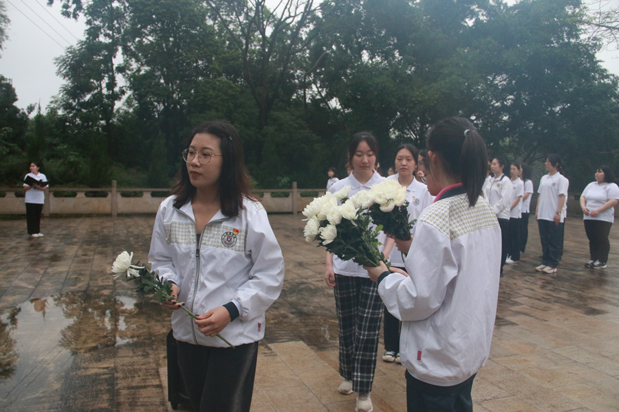 青山埋忠骨,山河念英魂。全体师生怀着无比崇敬的心情来到旺村革命烈士纪念碑。他们依次向革命烈士敬献鲜花并进行深鞠三躬,深切缅怀革命先辈们的丰功伟绩。接着,全体肃立,为革命先烈默哀三分钟,深切表达对他们的哀悼之情。
