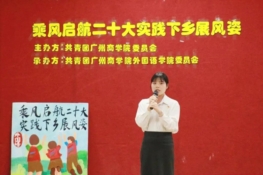 陈英填通过分享具体的活动形式,强调暑期“三下乡”社会活动的重要性。他分享了在寻访潮州的红色基因和记忆以及感受文化与历史的脉动中得到的启迪,同时呼吁同学们积极传承与保护红色历史文化,用实际行动展现外院学子践行红色精神的坚定意志。