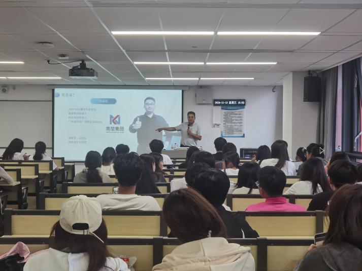 李嘉聪自2014年毕业以来,通过多年创新与开拓,从创办设计工作室起步,逐步深耕跨境电商行业,创立了南堃集团,并以出色的成就赢得了广泛的市场认可。此次讲座中,李嘉聪从自身的成长经历出发,围绕专业与市场的结合,向同学们深入讲解了他在创业过程中面临的挑战、积累的经验和重要的思维素养。
