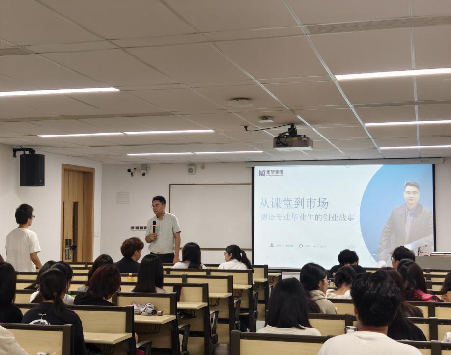 为进一步拓宽学生的职业视野,增强德语专业学生对未来职业规划的认识,帮助其更好了解德语专业的职业发展方向,我院德语专业于11月13日下午邀请了校企合作单位南堃集团创始人、德语专业优秀校友李嘉聪进行创业故事分享。讲座由外国语学院德语专业教师周婷主持,24级德语专业学生参与了本次活动。