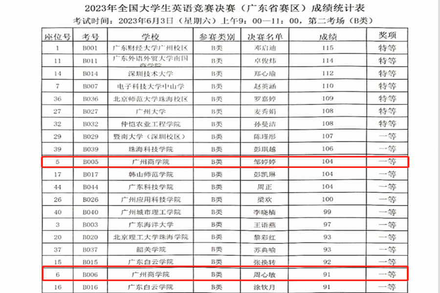6月3日,2023年全国大学生英语竞赛(NECCS)决赛(广东省赛区)在广东财经大学拉开帷幕,我校外国语学院李卓华老师指导的外国语学院学生邹婷婷、周心敏、范隽宇、会计学院学生肖云舒、邓晔盈、信息技术与工程学院学生刘希晨、经济学院学生廖家乐以及现代信息产业学院学生陈语涵均荣获省级一等奖。